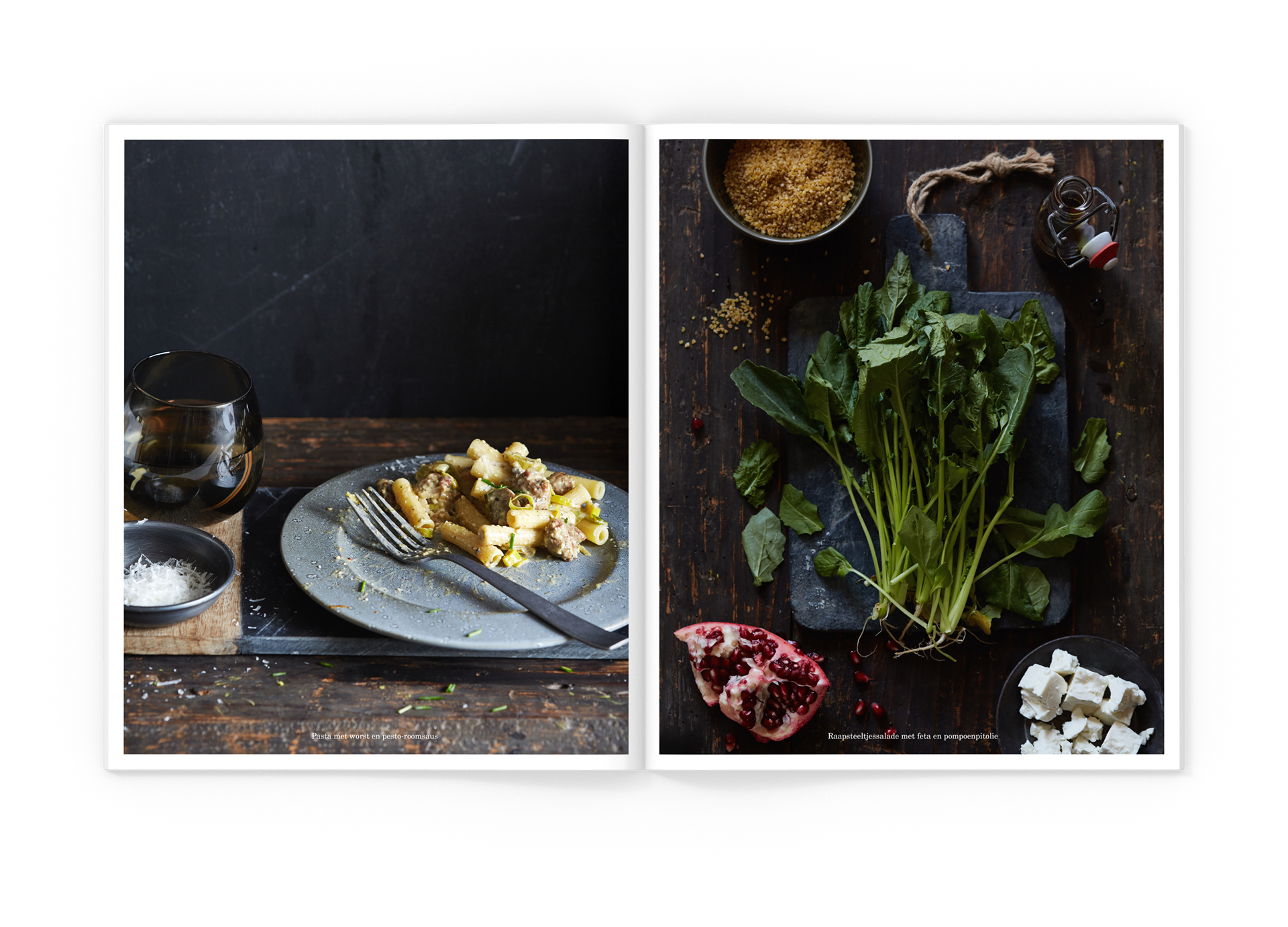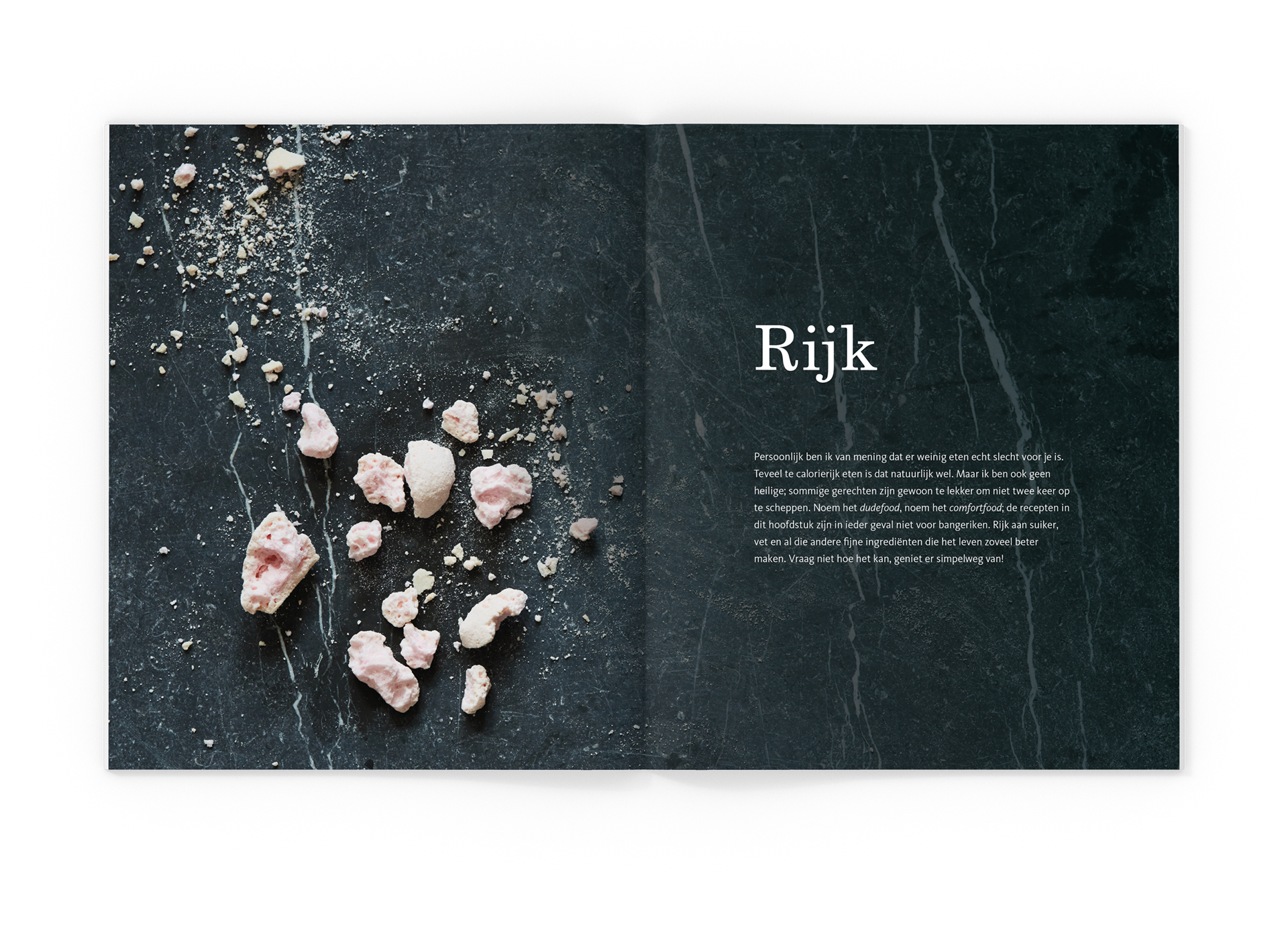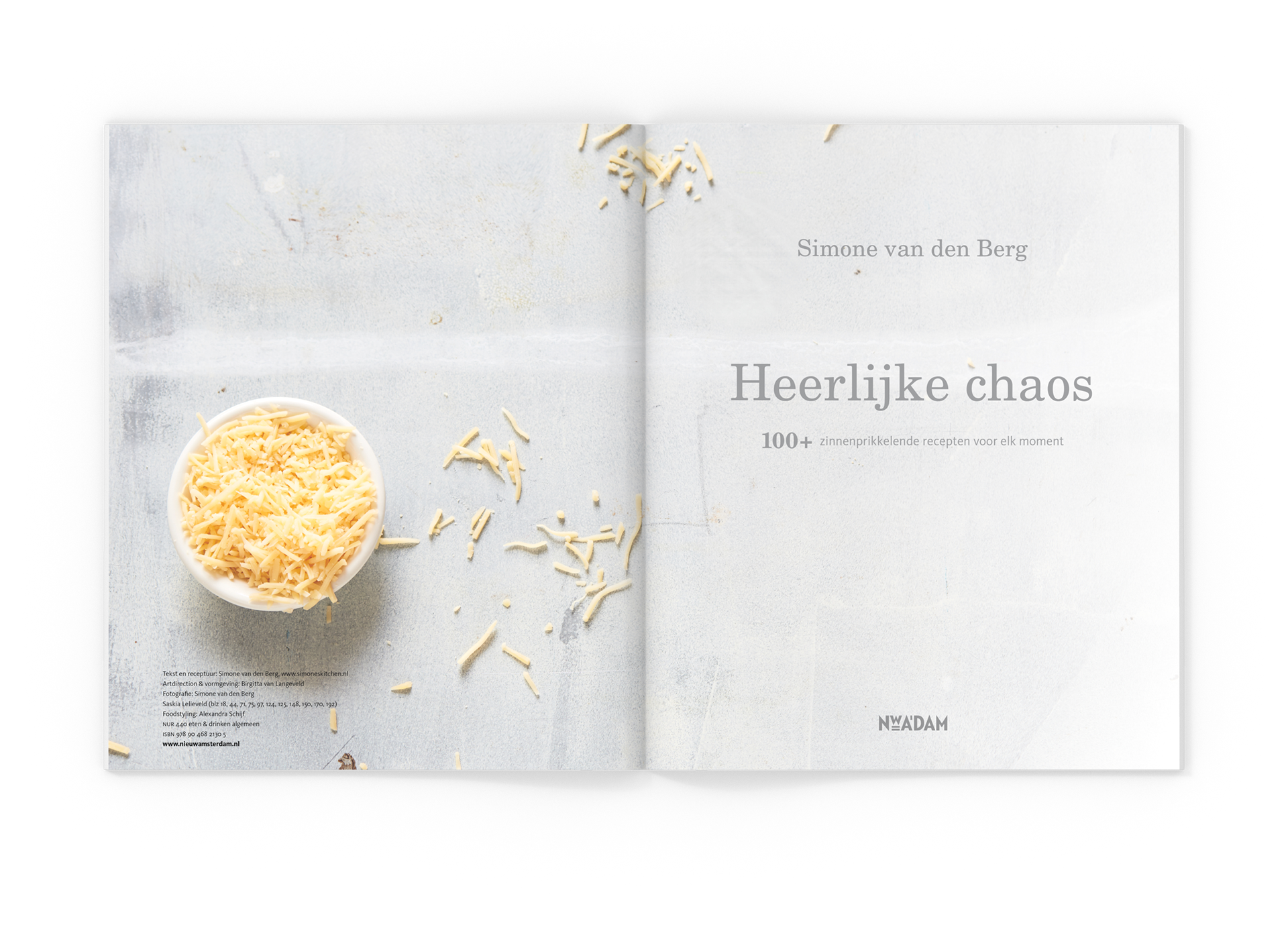 Simone van den Berg is een foodfotograaf met een flinke staat van dienst. Ze heeft de fotografie van tal van kookboeken verzorgd, daarnaast is ze zeer succesvol met haar foodblog Simone's Kitchen. Het was hoog tijd voor haar eigen kookboek. Haar wens: een mooi boek waar de fotografie de hoofdrol speelt. Voor de vormgeving koos ik dus voor modern, sober met een snufje klassiek.